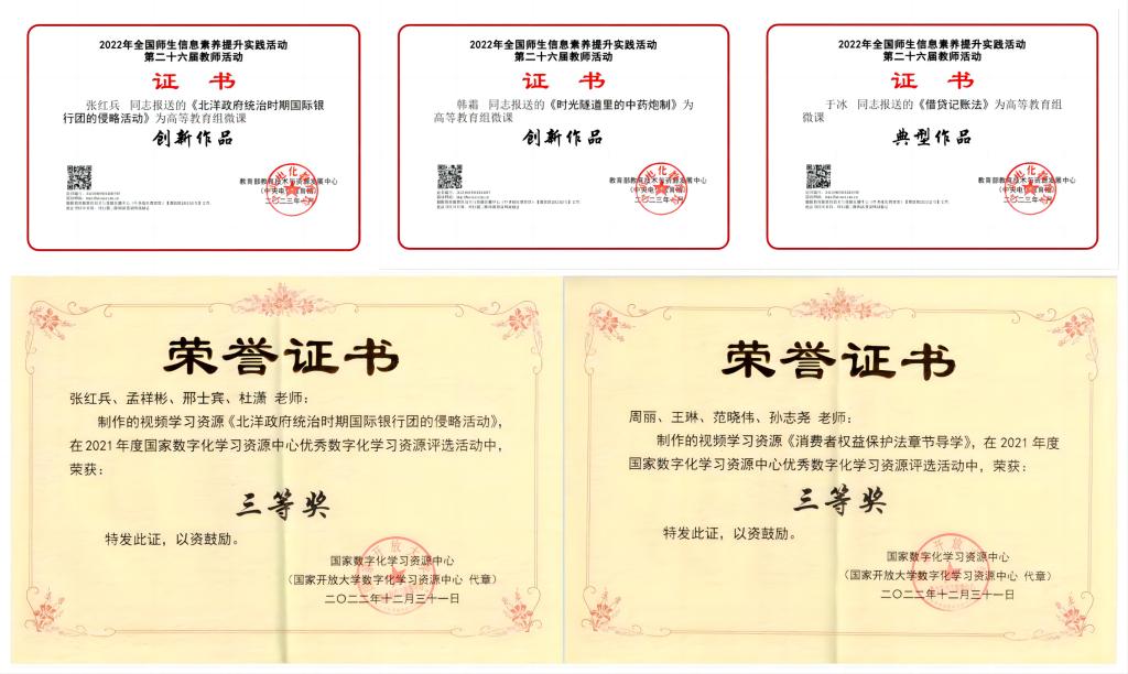 另外,國家數字化學習資源中心在2022年12月公布了“2021年度國家數字化學習資源中心優秀數字化學習資源評選”的評選結果。本次評選全國共評選出優秀教學視頻30個,其中一等獎5個,二等獎10個,三等獎15個。我校選送的視頻資源《北洋政府統治時期國際銀行團的侵略活動》和《消費者權益保護法章節導學》獲得2021年度國家數字化學習資源中心優秀教學視頻三等獎。