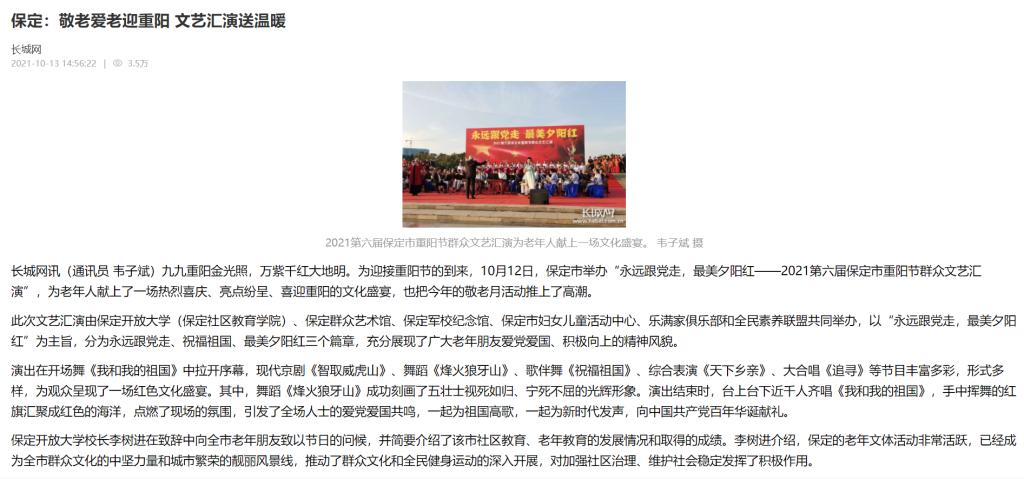 此次文藝匯演由保定開放大學(保定社區教育學院)、保定群眾藝術館、保定軍校紀念館、保定市婦女兒童活動中心、樂滿家俱樂部和全民素養聯盟共同舉辦,以“永遠跟黨走,最美夕陽紅”為主旨,分為永遠跟黨走、祝福祖國、最美夕陽紅三個篇章,充分展現了廣大老年朋友愛黨愛國、積極向上的精神風貌。