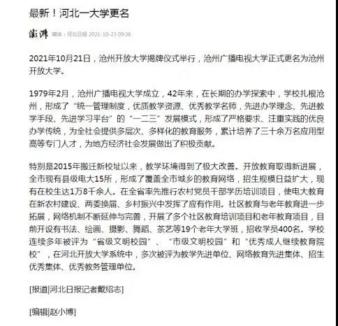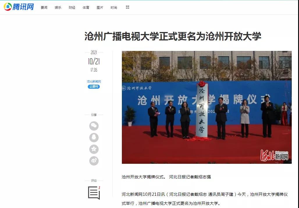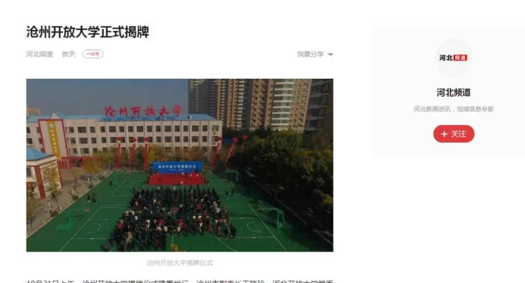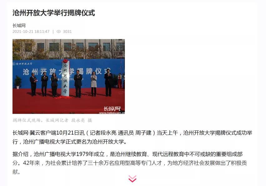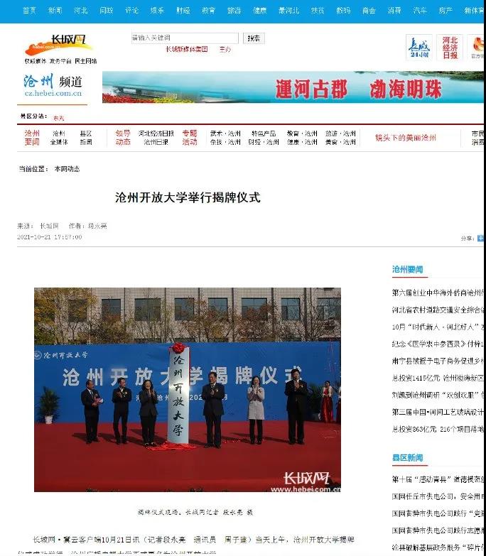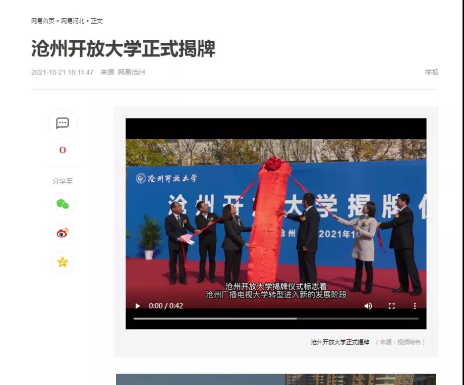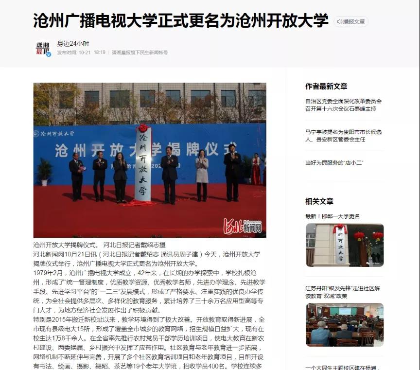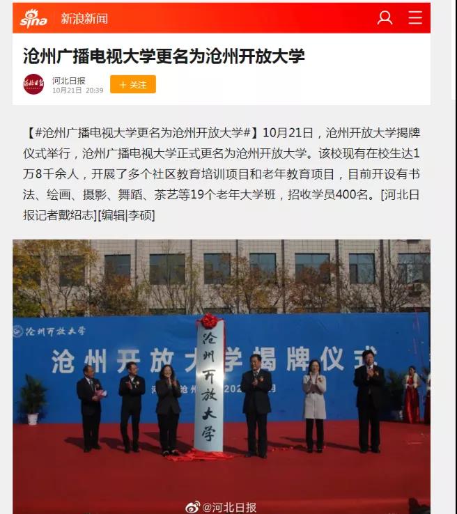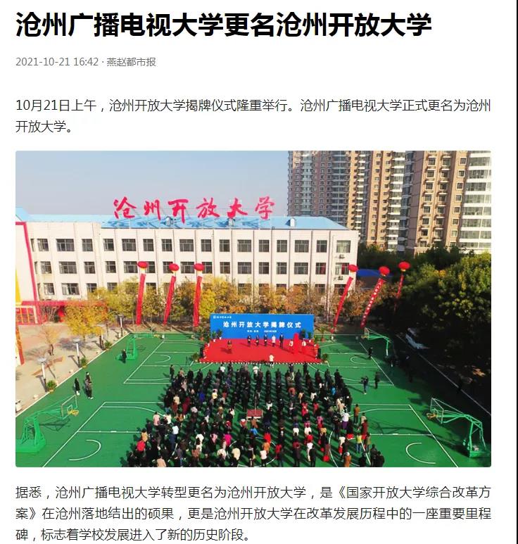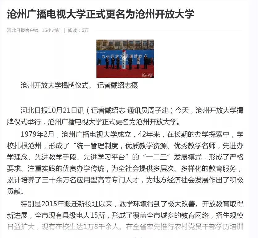 日前,滄州開放大學(xué)舉行揭牌儀式,網(wǎng)易新聞、河北新聞網(wǎng)、《燕趙都市報》新媒體、長城網(wǎng)、《滄州日報》、《滄州晚報》、滄州電視臺、滄州電臺等媒體對揭牌更名和滄州廣播電視大學(xué)所做的歷史貢獻(xiàn)給予了報道。此后,《人民日報》、《瀟湘晨報》等報刊新媒體和騰訊網(wǎng)、新浪網(wǎng)、今日頭條、一點(diǎn)資訊、新浪微博等十余家媒體平臺對報道進(jìn)行轉(zhuǎn)載,進(jìn)一步提升了滄州開放大學(xué)的知名度和美譽(yù)度。