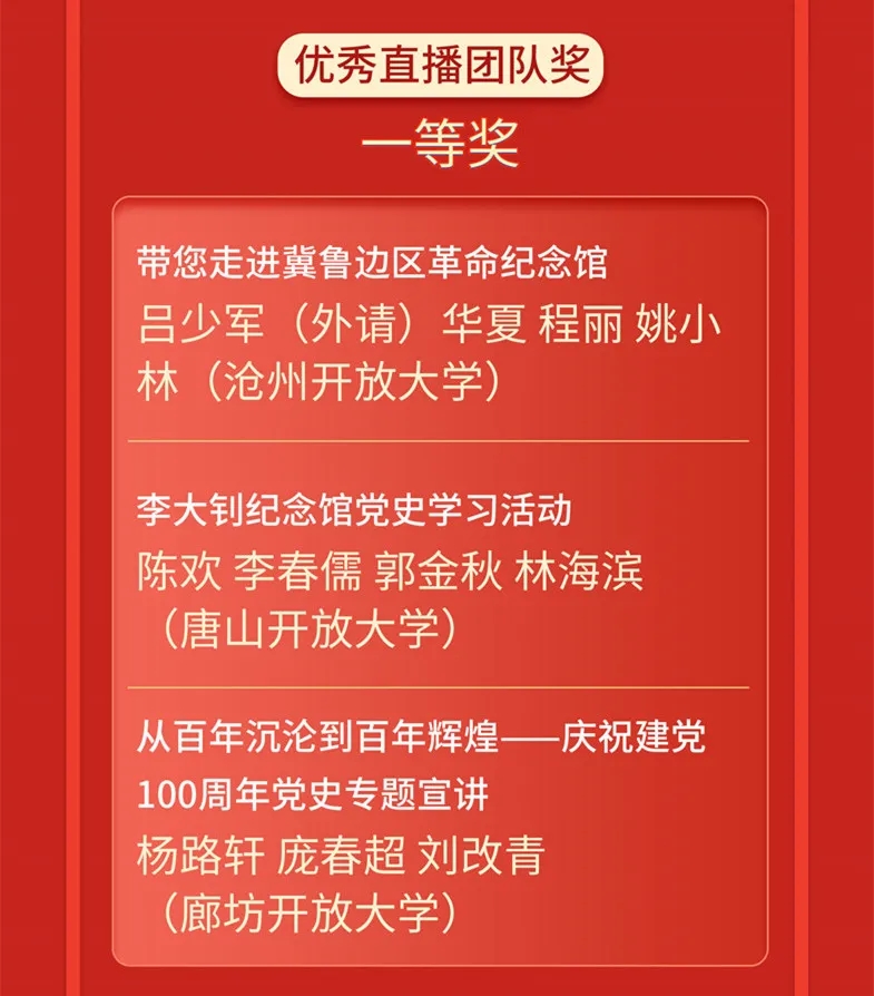 由呂少軍(外請(qǐng))、華夏、程麗、姚小林組成的《帶您走進(jìn)冀魯邊區(qū)革命紀(jì)念館》直播團(tuán)隊(duì)榮獲團(tuán)隊(duì)一等獎(jiǎng)。