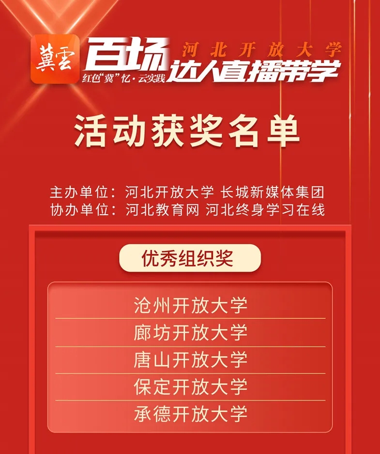 在河北開(kāi)放大學(xué)與長(zhǎng)城新媒體集團(tuán)聯(lián)合組織開(kāi)展的“紅色‘冀’憶·云實(shí)踐”百場(chǎng)達(dá)人直播帶學(xué)活動(dòng)年終評(píng)審中,滄州開(kāi)放大學(xué)榮獲“優(yōu)秀組織獎(jiǎng)”。