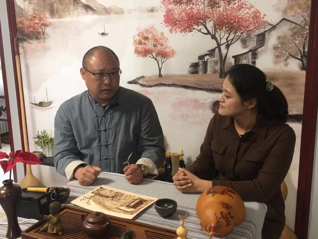 本次直播采用訪談的形式。陳曉飛老師首先介紹了這項傳統技藝的基本知識。葫蘆烙畫是中華民族流傳下來的一項古老的手工技術。這項技術是將葫蘆的木質材料與中國傳統的燙畫技法相結合,以鐵為筆,以火為墨創作藝術作品,完美的葫蘆烙畫作品給觀賞者帶來審美享受,產生收藏的愿望。