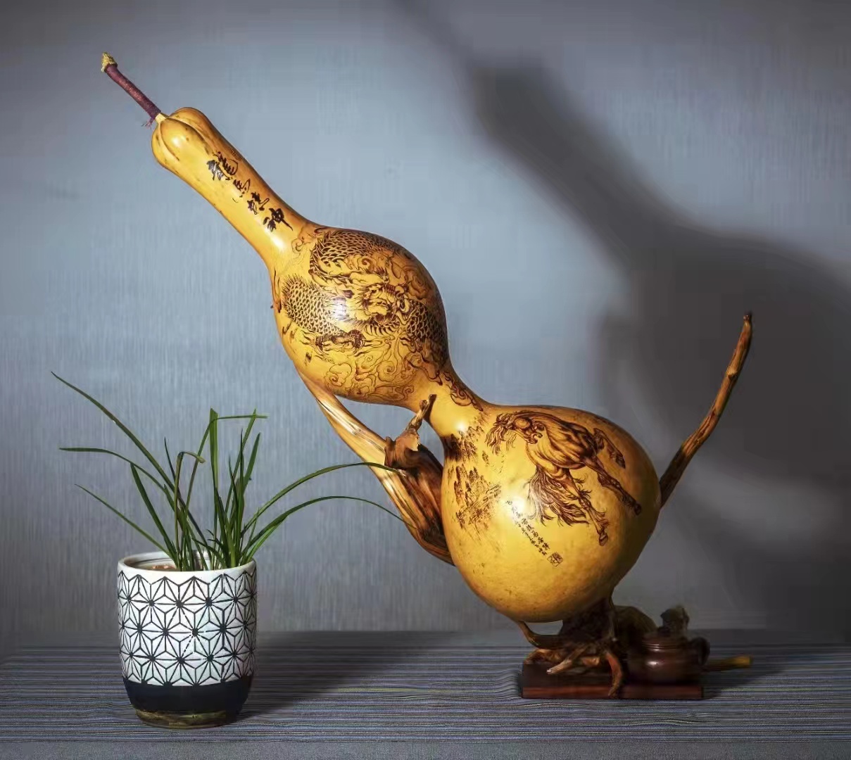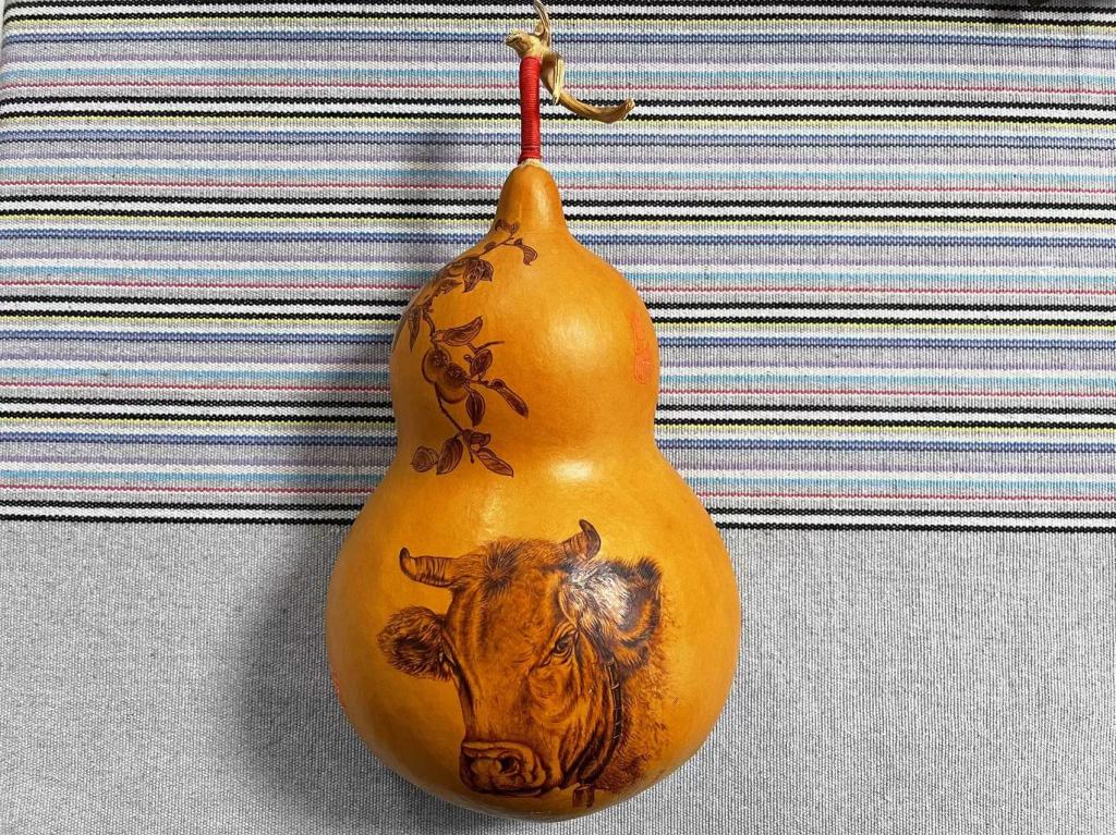 葫蘆諧音福祿,擁有葫蘆即擁有福祿,贈人葫蘆即贈人福祿。在這個具有美好寓意的物品上進行藝術創作,更使葫蘆由農家庭院登上了藝術殿堂,成為集質樸自然與精致高雅于一身藝術品,而葫蘆烙畫技藝也成為我國傳統非物質文化遺產。