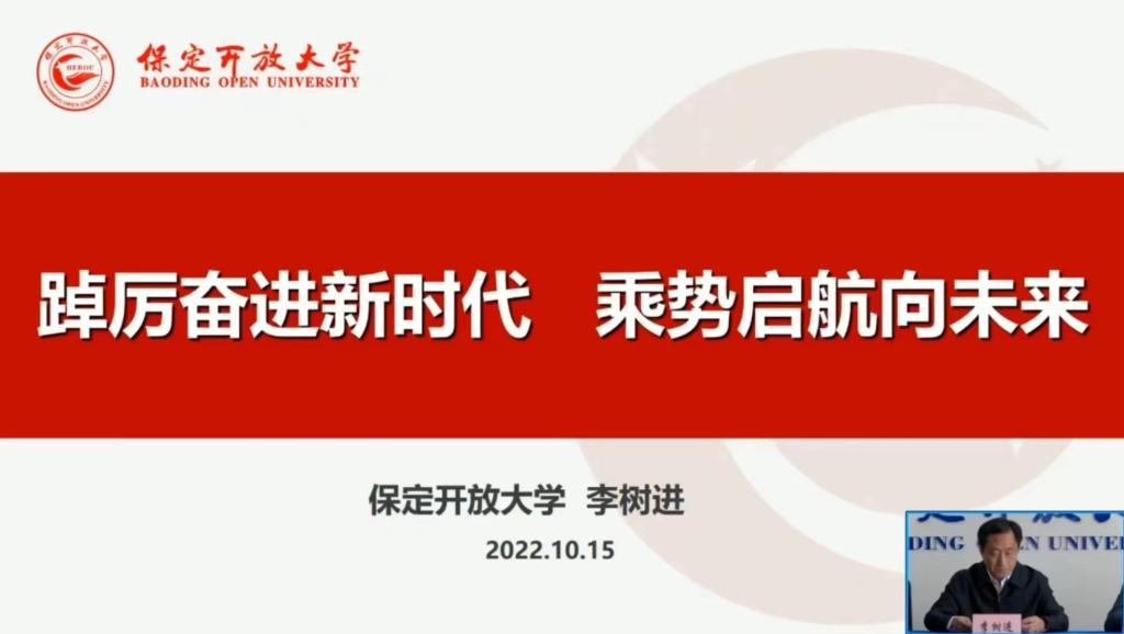 10月15日上午,保定開放大學舉行2022年秋季開放教育新生線上開學典禮,校長李樹進寄語新生要志存高遠,修身立德,追夢無悔青春。保定開放大學直屬497名新生相聚在云端,同上一堂課,逐夢新征程。典禮由副校長顧文博主持。