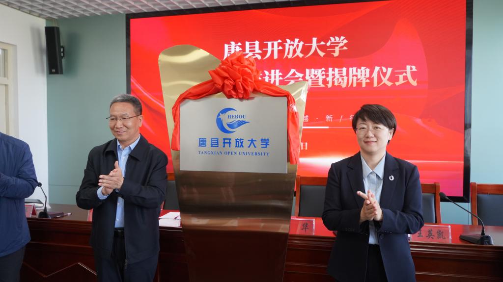 在熱烈的氣氛中,馬俊瑞、劉華共同為唐縣開放大學揭牌。