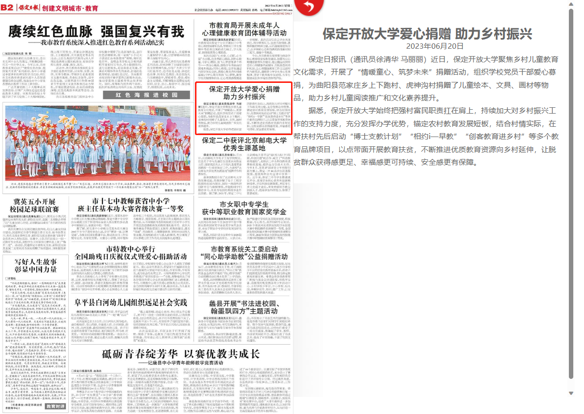 據悉,保定開放大學始終把強村富民職責扛在肩上,持續加大對鄉村振興工作的支持力度,充分發揮辦學優勢,錨定農村教育發展短板,結合村情實際,在幫扶村先后啟動“博士支教計劃”“相約i—早教”“創客教育進鄉村”等多個教育品牌項目,以點帶面開展教育扶貧,不斷推進優質教育資源向鄉村延伸,讓脫貧群眾獲得感更足、幸福感更可持續、安全感更有保障。