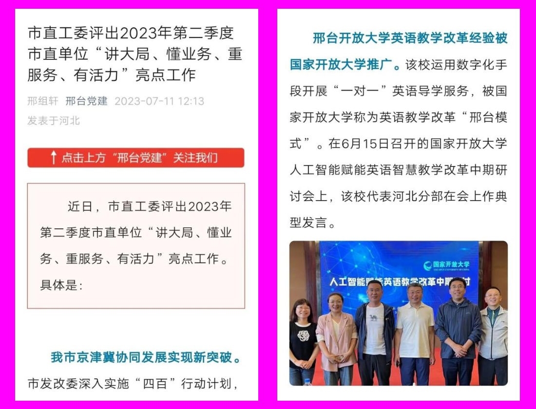 近日,2023年第二季度市直單位“講大局、懂業務、重服務、有活力”亮點工作評選揭曉。“邢臺開放大學英語改革經驗被國家開放大學推廣”榜上有名。