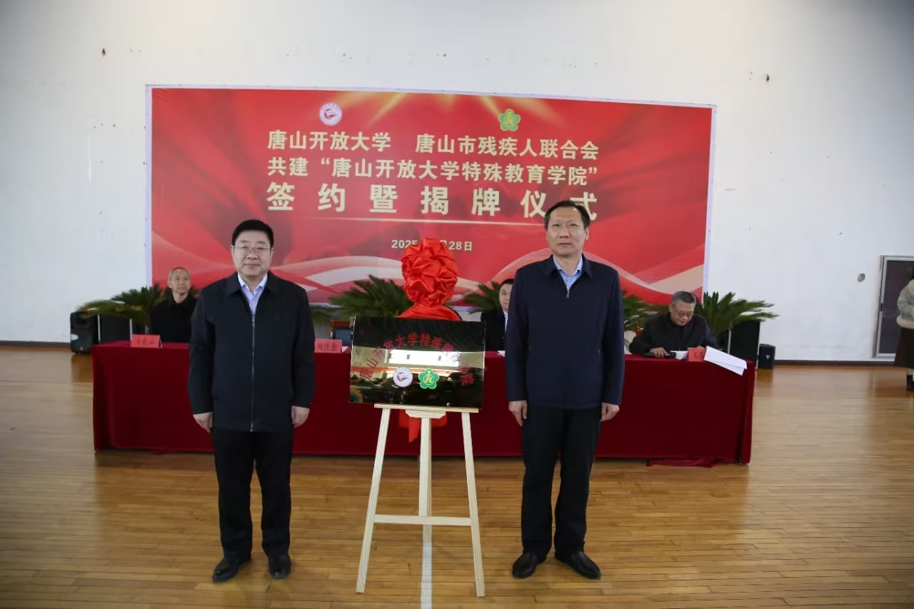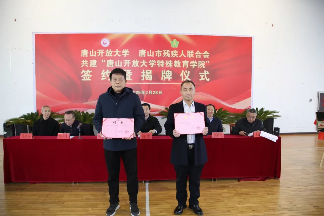 2月28日,唐山開放大學特殊教育學院簽約暨揭牌儀式在唐山市殘聯舉行。唐山市委教育工委專職副書記趙乾,唐山開放大學黨委書記張雪峰,唐山市殘聯黨組書記、理事長劉連奎,唐山開放大學校長陳金釘,唐山開放大學副校長楊小冀,唐山市殘聯黨組成員、副理事長王善國,唐山市殘聯二級調研員馬金山等出席儀式。各縣(市、區)殘聯副理事長,唐山開放大學科級以上干部,唐山市殘聯機關、教育中心、就業中心、體管中心全體人員,醫療中心負責同志以及陽光學校的全體師生等參加儀式。