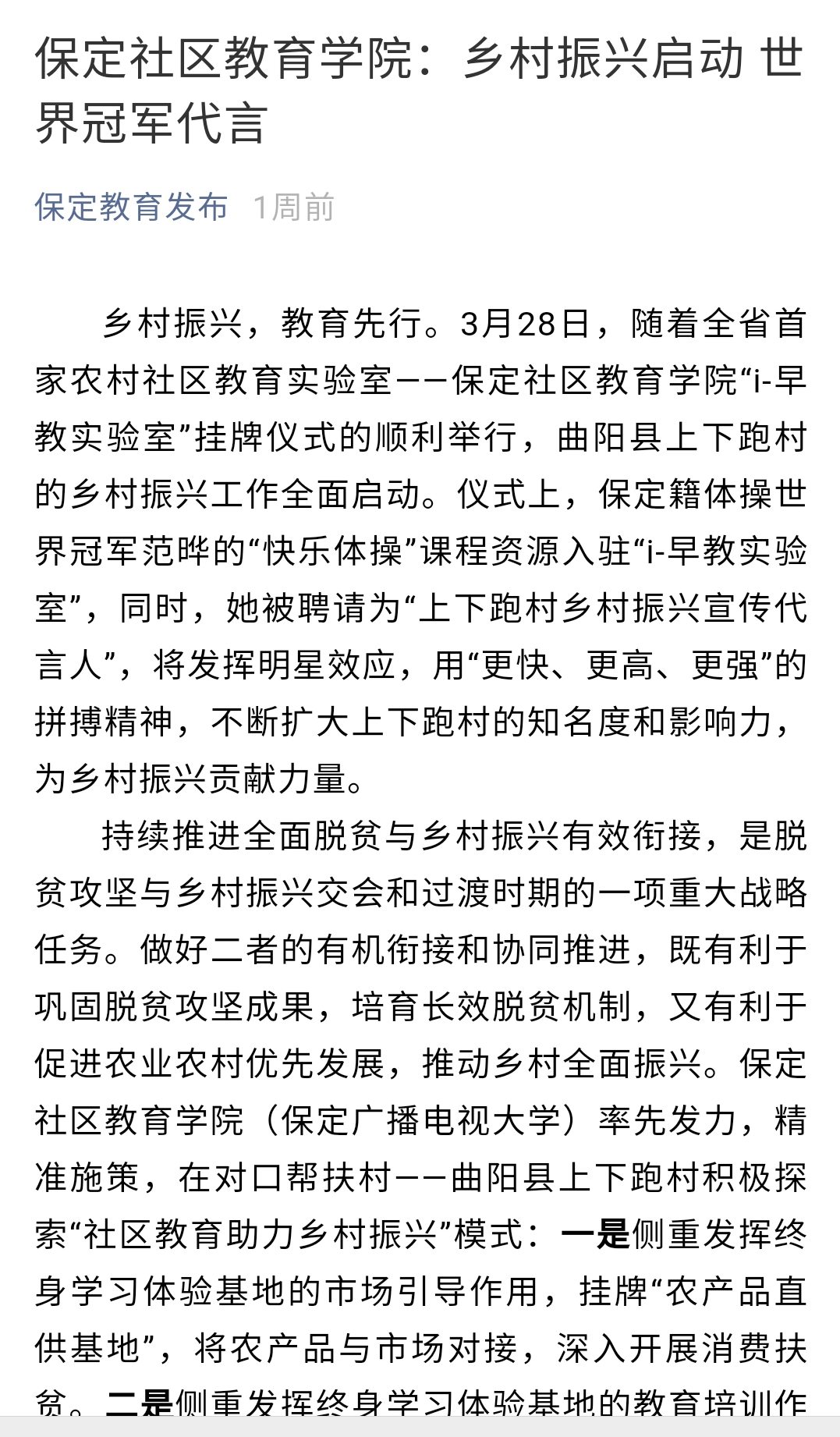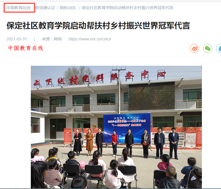 在鞏固拓展脫貧攻堅(jiān)成果,接續(xù)推動(dòng)脫貧地區(qū)發(fā)展和鄉(xiāng)村全面振興的關(guān)鍵時(shí)期,保定社區(qū)教育學(xué)院率先發(fā)力、精準(zhǔn)施策,以“鄉(xiāng)村振興,教育先行”為切入點(diǎn),在曲陽(yáng)縣上下跑村掛牌全省首家農(nóng)村社區(qū)教育實(shí)驗(yàn)室——“i-早教實(shí)驗(yàn)室”,邀請(qǐng)?bào)w操世界冠軍范曄“快樂(lè)體操”入駐并為上下跑村鄉(xiāng)村振興代言。這是發(fā)揮學(xué)校優(yōu)勢(shì)開(kāi)展精準(zhǔn)扶貧、教育扶貧的有益嘗試,也是鞏固拓展脫貧攻堅(jiān)成效、有效銜接鄉(xiāng)村振興的有益探索,更是發(fā)展公平而有質(zhì)量的教育、開(kāi)展農(nóng)村社區(qū)教育的有益實(shí)踐。中國(guó)教育在線、唐堯網(wǎng)、保定晚報(bào)、保定電視臺(tái)等媒體對(duì)此進(jìn)行報(bào)道。