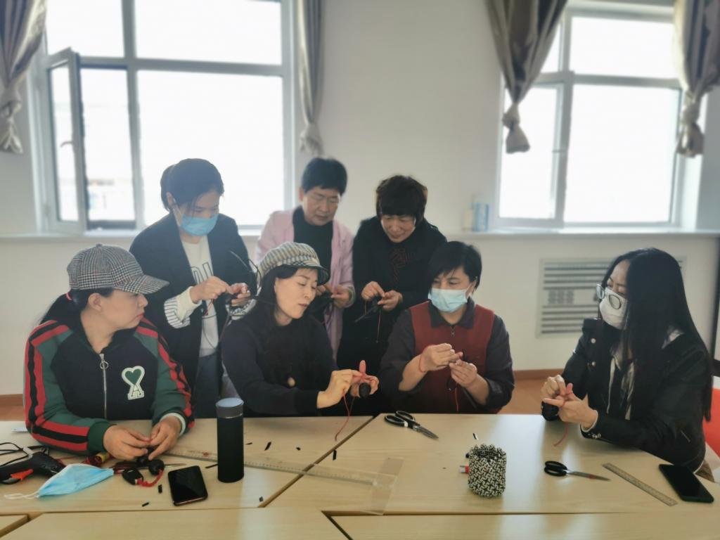 “藤編藝術(shù)”課堂采用線上線下相結(jié)合的教學(xué)模式,教師課上手把手的教學(xué)員編織玫瑰花鑰匙墜、水培植物筐。一根根藤條在學(xué)員們手中飛舞,大家感受著傳統(tǒng)手工藝的魅力。
