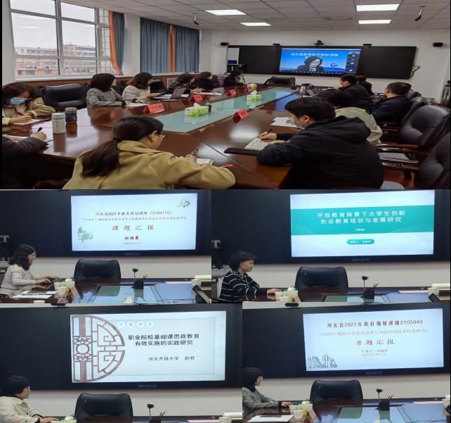 張淑蓮首先代表學校對各位專家蒞臨會議表示熱烈的歡迎和誠摯的感謝,并就學校更名及積極推動轉型發展的基本情況做了簡要介紹。《“十四五”期間服務全民終身學習資源的開發建設及共享共建機制研究》課題組負責人劉福霞、《開放教育背景下大學生創新創業教育現狀與發展研究》課題組負責人李軼華、《職業院校基礎課思政教育有效實施的實踐研究》課題組負責人趙君、《高校產教融合信息化建設與內部控制體系構建研究》課題組負責人劉曉欣先后就所承擔課題的研究意義、研究內容及方法、研究實施方案以及預期研究成果等進行了詳細匯報。5位專家圍繞課題研究的科學性與規范性逐一進行點評,并從研究內容、研究思路與方法以及創新性等不同角度提出了指導性意見和建議。